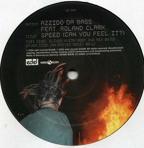ARTIST: Azzido Da Bass Feat Roland Clark LABEL: Club Tools CAT: 0137370CLU PRESSING: Germany YEAR: 2002 RPM: 33 FORMAT: 12 DISC/S: 1 GENRE: ElectronicaTechno STYLE: Techno COVER CONDITION: VG+ VINYL CONDITION: VG+ USED OR NEW: Secondhand