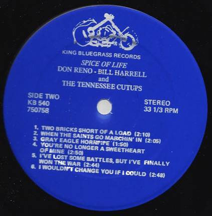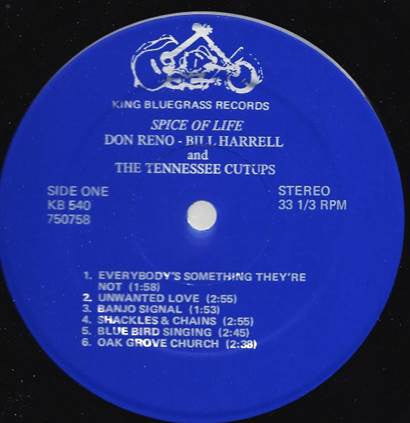 ARTIST: Don Reno, Bill Harrell And The Tennessee Cutups LABEL: King Bluegrass Records CAT: KB-540 PRESSING: US YEAR: 1975 RPM: 33 FORMAT: 12 DISC/S: 1 GENRE: BluegrassCountry STYLE: Bluegrass COVER CONDITION: VG+ VINYL CONDITION: NM- USED OR NEW: Secondhand