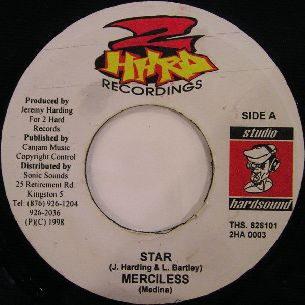 ARTIST: Merciless / Alley Cat LABEL: 2 Hard Recordings CAT: THS 828101 PRESSING: Jamaica YEAR: 1998 RPM: 45 FORMAT: 7 DISC/S: 1 GENRE: DancehallReggae STYLE: Dancehall COVER CONDITION: Generic VINYL CONDITION: VG USED OR NEW: Secondhand