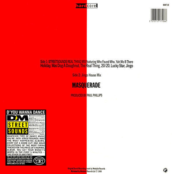 ARTIST: Masquerade LABEL: Hardcore CAT: HAKT 10 PRESSING: UK YEAR: 1988 RPM: 45 FORMAT: 12 DISC/S: 1 GENRE: ElectronicHouse STYLE: House COVER CONDITION: VG+ VINYL CONDITION: NM- USED OR NEW: Secondhand
