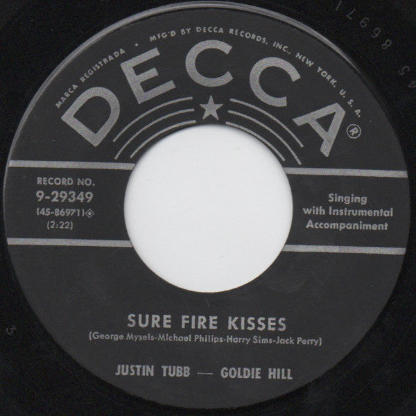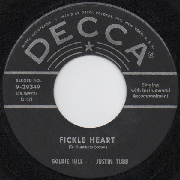 ARTIST: Justin Tubb / Goldie Hill LABEL: Decca CAT: 9-29349 PRESSING: US YEAR: 1954 RPM: 45 FORMAT: 7 DISC/S: 1 GENRE: FolkHonky Tonk STYLE: Honky Tonk COVER CONDITION: Generic VINYL CONDITION: VG USED OR NEW: Secondhand