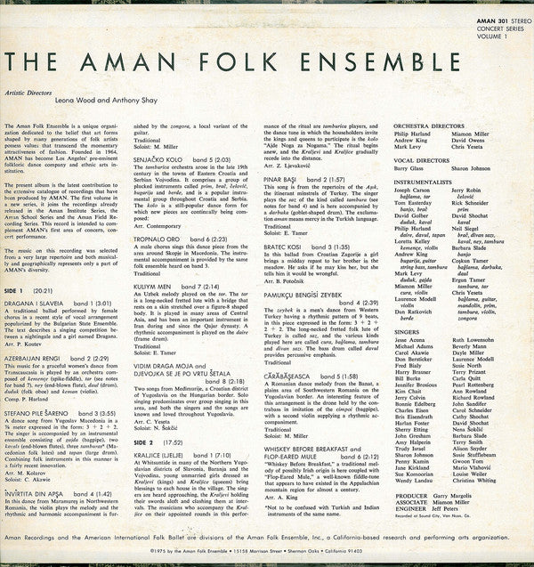 ARTIST: The Aman Folk Ensemble LABEL: Aman CAT: AMAN 301 PRESSING: US YEAR: 1975 RPM: 33 FORMAT: 12 DISC/S: 1 GENRE: Folk STYLE: 0 COVER CONDITION: VG VINYL CONDITION: VG USED OR NEW: Secondhand