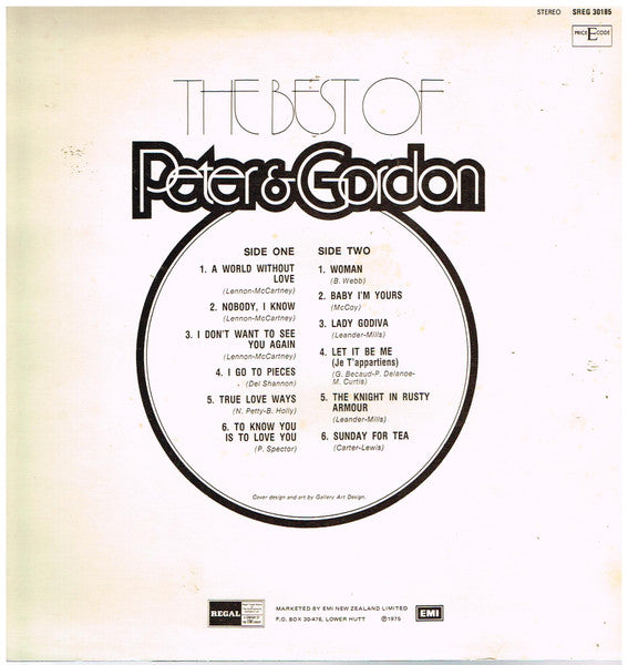 ARTIST: Peter & Gordon LABEL: Regal CAT: SREG 30185 PRESSING: NZ YEAR: 1975 RPM: 33 FORMAT: 12 DISC/S: 1 GENRE: PopRock STYLE: Pop COVER CONDITION: VG+ VINYL CONDITION: NM- USED OR NEW: Secondhand