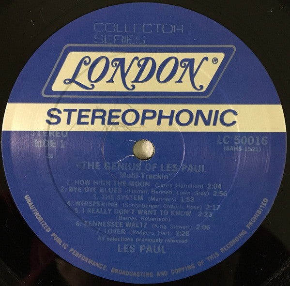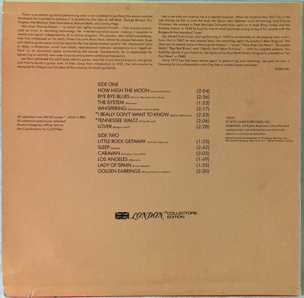 ARTIST: Les Paul LABEL: London Records CAT: LC 50016 PRESSING: US YEAR: 1979 RPM: 33 FORMAT: 12 DISC/S: 1 GENRE: Jazz STYLE: COVER CONDITION: NM VINYL CONDITION: NM USED OR NEW: Secondhand