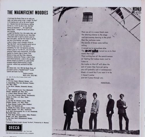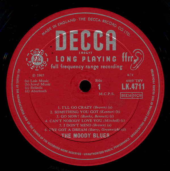 ARTIST: The Moody Blues (Mono) LABEL: Decca CAT: LK 4711 PRESSING: UK YEAR: 1965 RPM: 33 FORMAT: 12 DISC/S: 1 GENRE: Rock STYLE: COVER CONDITION: VG+ VINYL CONDITION: VG+ USED OR NEW: Secondhand