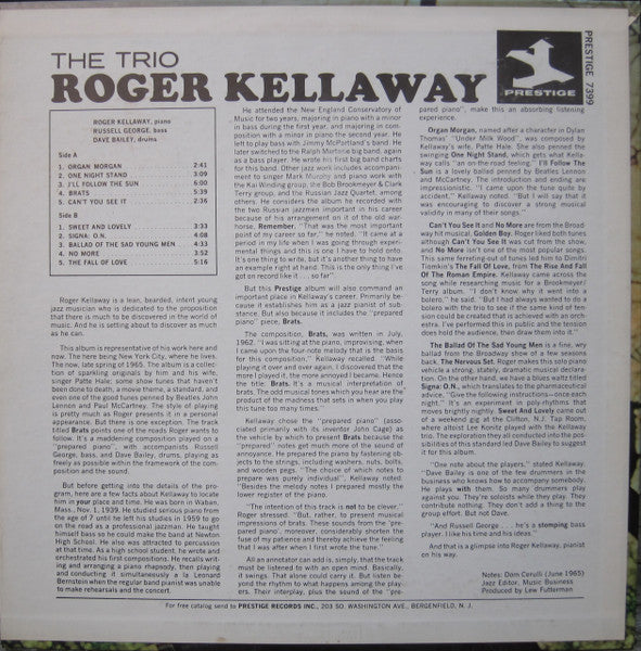 ARTIST: The Roger Kellaway Trio LABEL: Prestige CAT: PR 7399 PRESSING: US YEAR: 1972 RPM: 33 FORMAT: 12 DISC/S: 1 GENRE: Jazz STYLE: COVER CONDITION: NM VINYL CONDITION: NM USED OR NEW: Secondhand