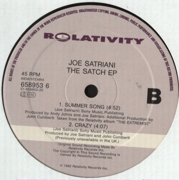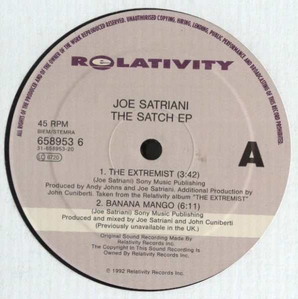 ARTIST: Joe Satriani LABEL: Relativity CAT: 658953 6 PRESSING: Europe YEAR: 1993 RPM: 45 FORMAT: 12 DISC/S: 1 GENRE: Blues RockRock STYLE: Blues Rock COVER CONDITION: VG VINYL CONDITION: NM USED OR NEW: Secondhand