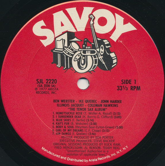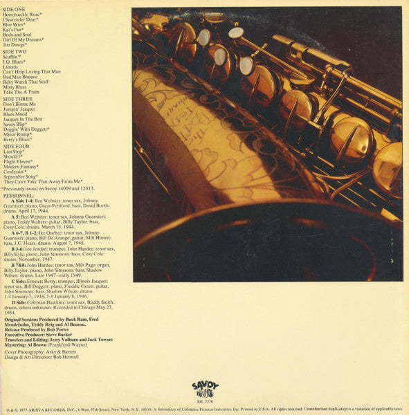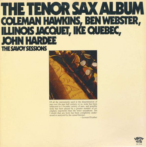 ARTIST: Coleman Hawkins, Ben Webster, Illinois Jacquet, Ike Quebec, John Hardee LABEL: Savoy CAT: SJL 2220 PRESSING: US YEAR: 1977 RPM: 33 FORMAT: 12 DISC/S: 2 GENRE: Jazz STYLE: 0 COVER CONDITION: VG++ VINYL CONDITION: NM / NM USED OR NEW: Secondhand