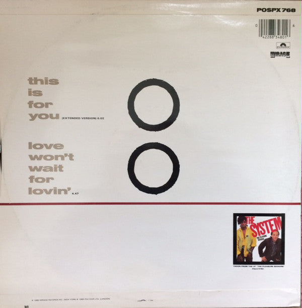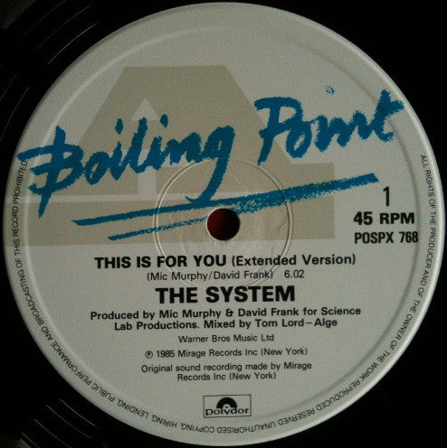 ARTIST: The System LABEL: Boiling Point CAT: POSPX 768 PRESSING: UK YEAR: 1985 RPM: 45 FORMAT: 12 DISC/S: 1 GENRE: Funk/Soul STYLE: COVER CONDITION: VG VINYL CONDITION: VG USED OR NEW: Secondhand