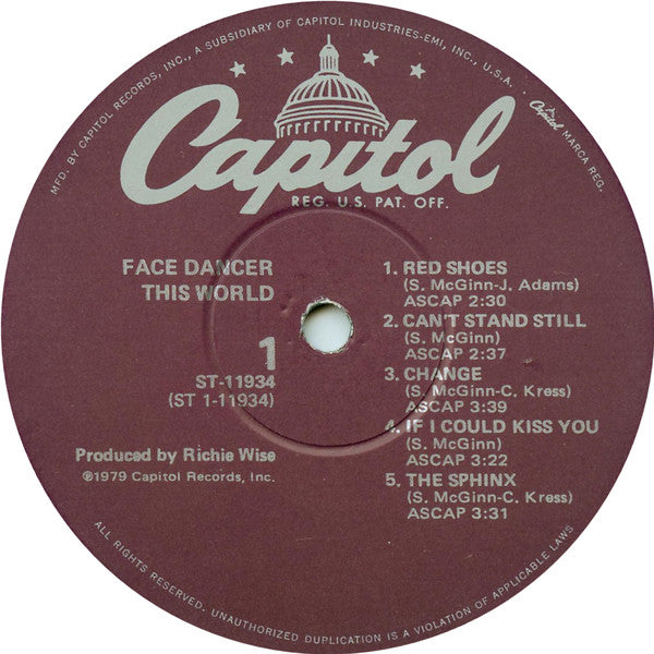 ARTIST: Face Dancer LABEL: Capitol CAT: ST-11934 PRESSING: US YEAR: 1979 RPM: 33 FORMAT: 12 DISC/S: 1 GENRE: Rock STYLE: COVER CONDITION: NM VINYL CONDITION: NM USED OR NEW: Secondhand