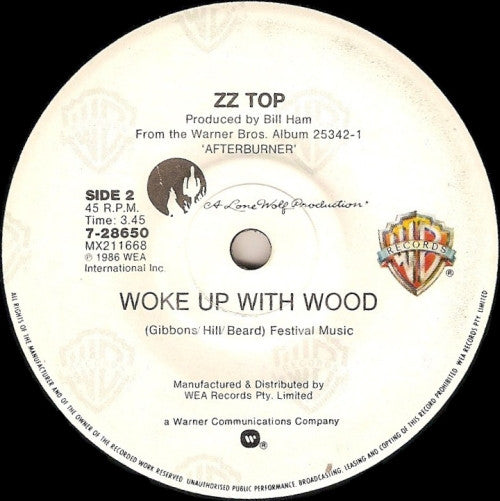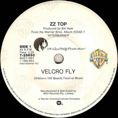 ARTIST: ZZ Top LABEL: Warner Bros CAT: 7-28650 PRESSING: Australia YEAR: 1986 RPM: 45 FORMAT: 7 DISC/S: 1 GENRE: Classic RockRock STYLE: Classic Rock COVER CONDITION: Generic VINYL CONDITION: VG++ USED OR NEW: Secondhand