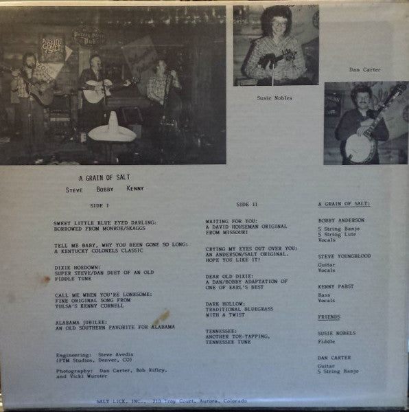 ARTIST: A Grain Of Salt LABEL: Salt Lick Records CAT: BE 408 PRESSING: US YEAR: RPM: 33 FORMAT: 12 DISC/S: 1 GENRE: BluegrassCountry STYLE: Bluegrass COVER CONDITION: VG+ VINYL CONDITION: NM USED OR NEW: Secondhand