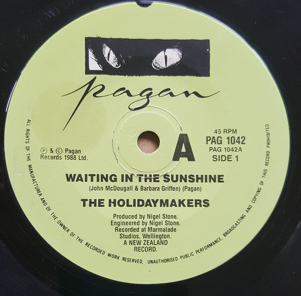 ARTIST: The Holidaymakers LABEL: Pagan CAT: PAG 1042 PRESSING: NZ YEAR: 1988 RPM: 45 FORMAT: 7 DISC/S: 1 GENRE: Kiwi MusicPop STYLE: 0 COVER CONDITION: Generic VINYL CONDITION: VG+ USED OR NEW: Secondhand