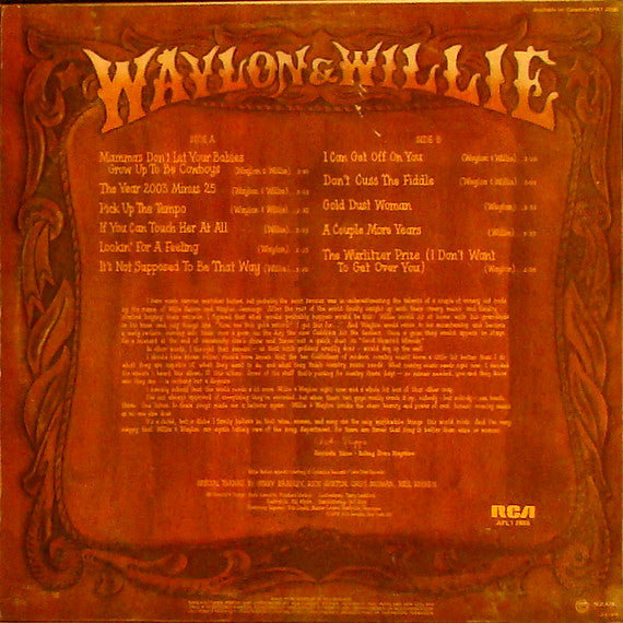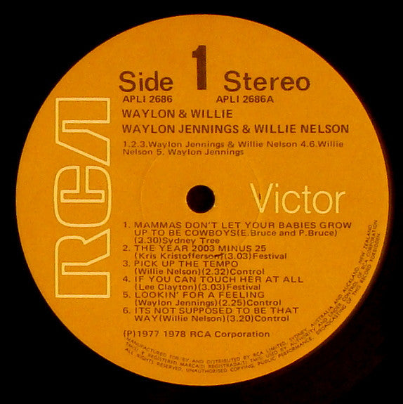 ARTIST: Waylon Jennings & Willie Nelson LABEL: RCA Victor CAT: APL1 2686 PRESSING: NZ YEAR: 1978 RPM: 33 FORMAT: 12 DISC/S: 1 GENRE: Country STYLE: COVER CONDITION: VG++ VINYL CONDITION: NM+ USED OR NEW: Secondhand
