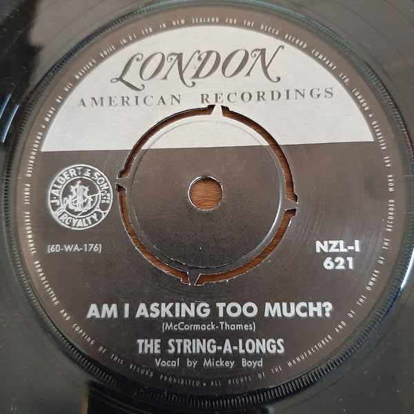 ARTIST: The String-A-Longs LABEL: London Records CAT: NZL-1 621 PRESSING: NZ YEAR: 1960 RPM: 45 FORMAT: 7 DISC/S: 1 GENRE: Pop STYLE: COVER CONDITION: Generic VINYL CONDITION: VG+ USED OR NEW: Secondhand