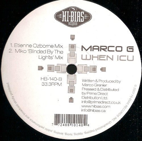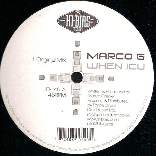 ARTIST: Marco G LABEL: Hi-Bias Records CAT: HB-140 PRESSING: Canada YEAR: 2007 RPM: 33 FORMAT: 12 DISC/S: 1 GENRE: ElectronicaTech House STYLE: Tech House COVER CONDITION: Generic VINYL CONDITION: VG+ USED OR NEW: Secondhand