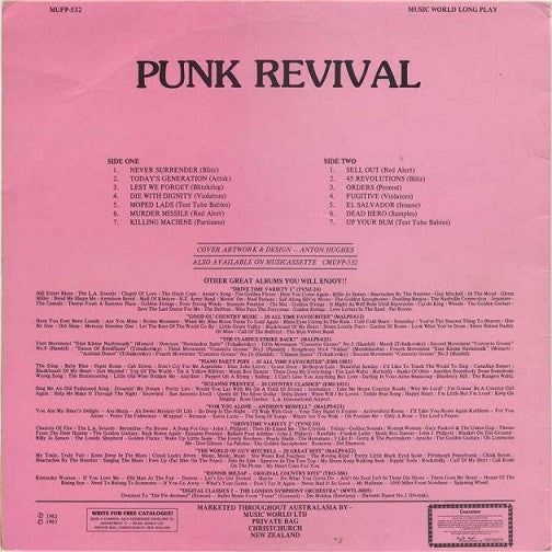 ARTIST: Various Artists LABEL: Music World CAT: MUFP-532 PRESSING: NZ YEAR: 1982 RPM: 33 FORMAT: 12 DISC/S: 1 GENRE: PunkRock STYLE: Punk COVER CONDITION: VG++ VINYL CONDITION: VG++ USED OR NEW: Secondhand