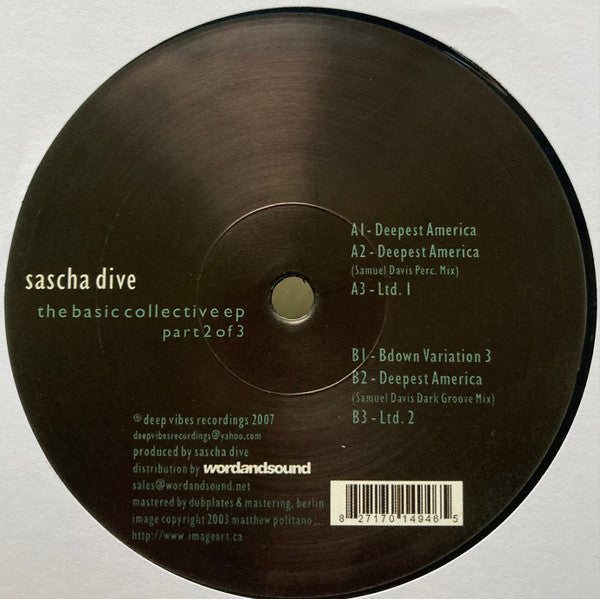 ARTIST: Sascha Dive LABEL: Deep Vibes Recordings CAT: DVR 003 PRESSING: Germany YEAR: 2007 RPM: 33 FORMAT: 12 DISC/S: 1 GENRE: Deep HouseElectronica STYLE: Deep House COVER CONDITION: Generic VINYL CONDITION: VG++ USED OR NEW: Secondhand