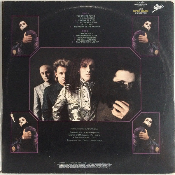 ARTIST: Dead Or Alive LABEL: Epic CAT: ELPS 4472 PRESSING: NZ YEAR: 1985 RPM: 33 FORMAT: 12 DISC/S: 1 GENRE: ElectronicaSynth Pop STYLE: Synth Pop COVER CONDITION: VG+ VINYL CONDITION: VG USED OR NEW: Secondhand