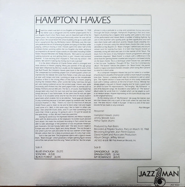 ARTIST: Hampton Hawes LABEL: Jazz Man CAT: JAZ 5022 PRESSING: US YEAR: 1981 RPM: 33 FORMAT: 12 DISC/S: 1 GENRE: Jazz STYLE: COVER CONDITION: VG+ VINYL CONDITION: NM USED OR NEW: Secondhand