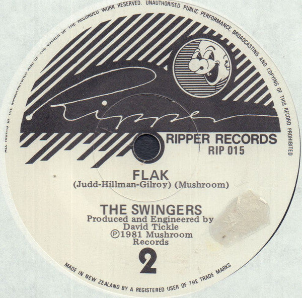 ARTIST: The Swingers LABEL: Ripper Records CAT: RIP 015 PRESSING: NZ YEAR: 1981 RPM: 45 FORMAT: 7 DISC/S: 1 GENRE: Kiwi MusicRock STYLE: Kiwi Music COVER CONDITION: Generic VINYL CONDITION: VG+ USED OR NEW: Secondhand