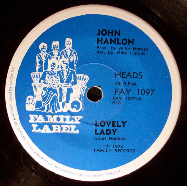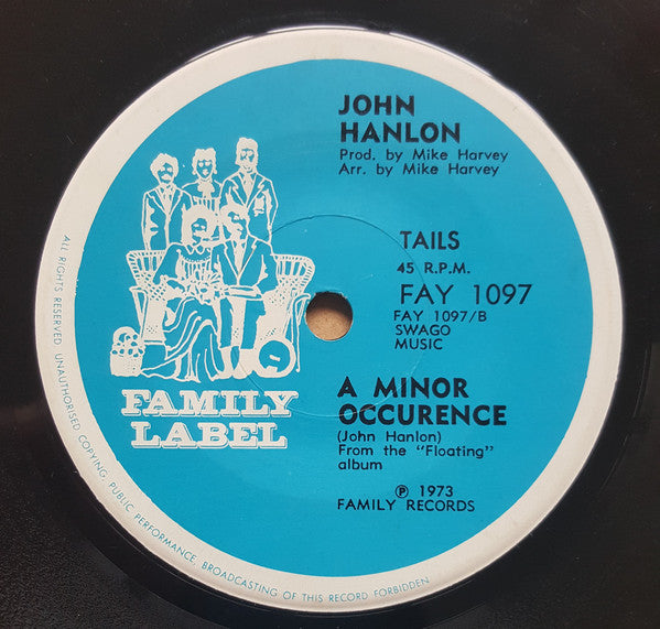 ARTIST: John Hanlon LABEL: Family CAT: FAY 1097 PRESSING: NZ YEAR: 1974 RPM: 45 FORMAT: 7 DISC/S: 1 GENRE: Rock STYLE: 0 COVER CONDITION: Generic VINYL CONDITION: VG USED OR NEW: Secondhand