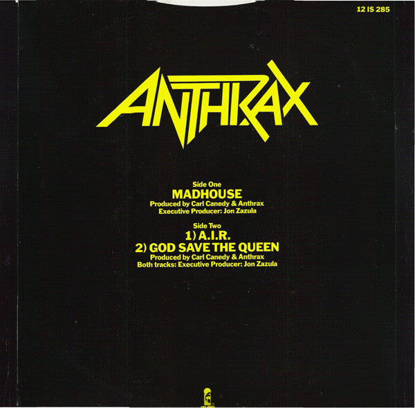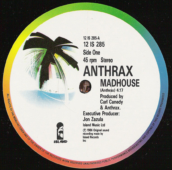 ARTIST: Anthrax LABEL: Island Records CAT: 12 IS 285 PRESSING: UK YEAR: 1986 RPM: 33 FORMAT: 12 DISC/S: 1 GENRE: RockSpeed Metal STYLE: Speed Metal COVER CONDITION: NM VINYL CONDITION: NM USED OR NEW: Secondhand