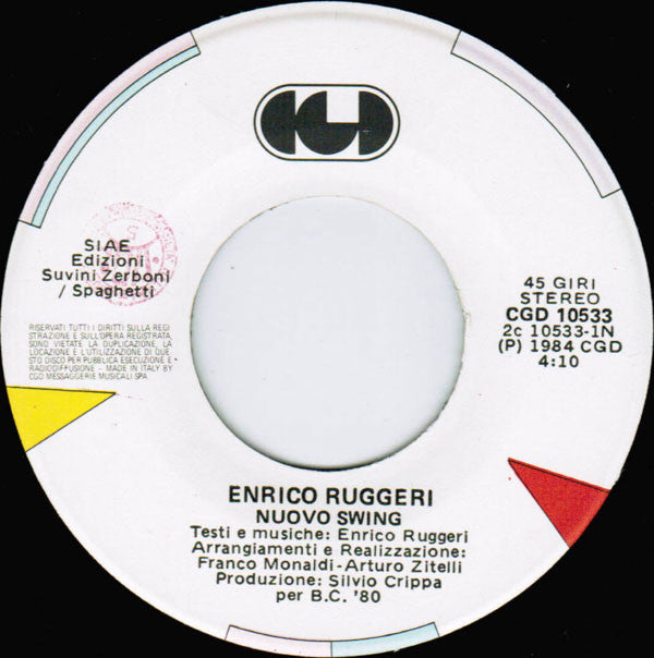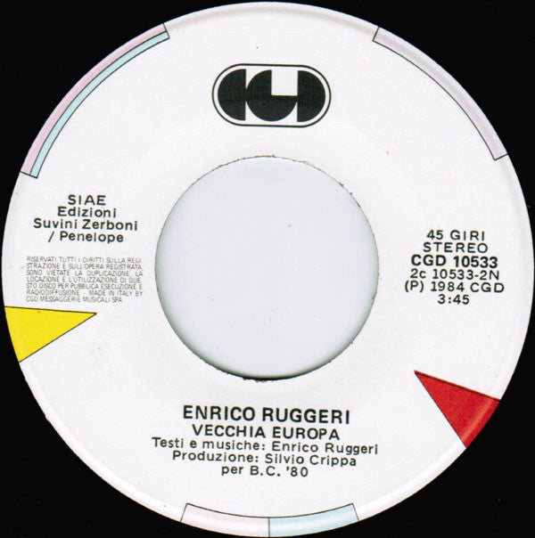 ARTIST: Enrico Ruggeri LABEL: CGD CAT: CGD 10533 PRESSING: Italy YEAR: 1984 RPM: 45 FORMAT: 7 DISC/S: 1 GENRE: PopRock STYLE: Pop COVER CONDITION: VG VINYL CONDITION: VG- USED OR NEW: Secondhand