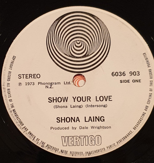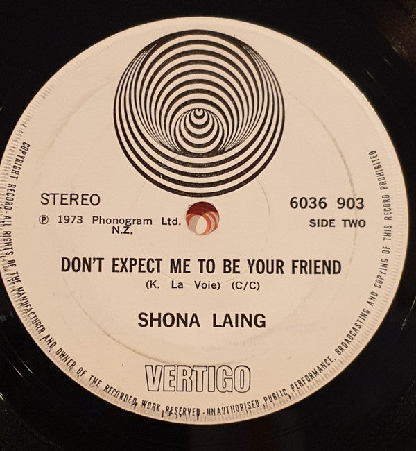 ARTIST: Shona Laing LABEL: Vertigo CAT: 6036 903 PRESSING: NZ YEAR: 1973 RPM: 45 FORMAT: 7 DISC/S: 1 GENRE: Kiwi MusicRock STYLE: Pop COVER CONDITION: Generic VINYL CONDITION: VG+ USED OR NEW: Secondhand