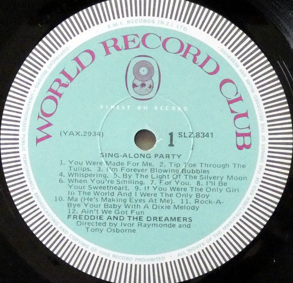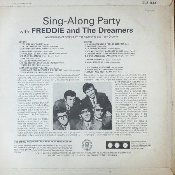 ARTIST: Freddie And The Dreamers LABEL: World Record Club CAT: SLZ 8341 PRESSING: NZ YEAR: 0 RPM: 33 FORMAT: 12 DISC/S: 1 GENRE: PopRock STYLE: Pop COVER CONDITION: VG- VINYL CONDITION: VG USED OR NEW: Secondhand