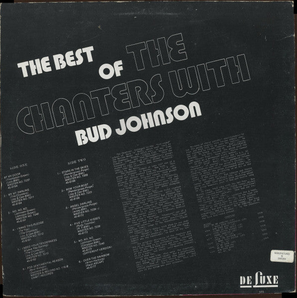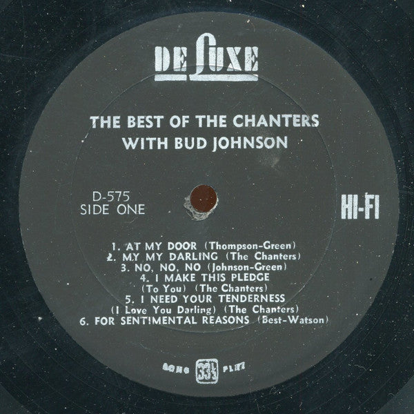 ARTIST: The Chanters LABEL: DeLuxe CAT: D-575 PRESSING: Sweden YEAR: 1980 RPM: 33 FORMAT: 12 DISC/S: 1 GENRE: Doo WopRock STYLE: Doo Wop COVER CONDITION: NM VINYL CONDITION: NM USED OR NEW: Secondhand