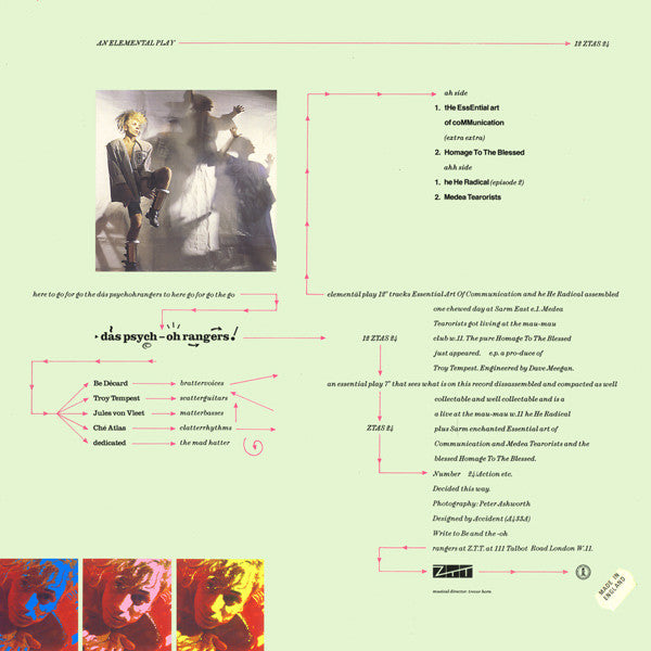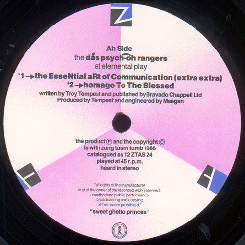 ARTIST: Das Psych-Oh! Rangers LABEL: ZTT CAT: 12 ZTAS 24 PRESSING: UK YEAR: 1986 RPM: 33 FORMAT: 12 DISC/S: 1 GENRE: Rock STYLE: COVER CONDITION: NM- VINYL CONDITION: NM USED OR NEW: Secondhand