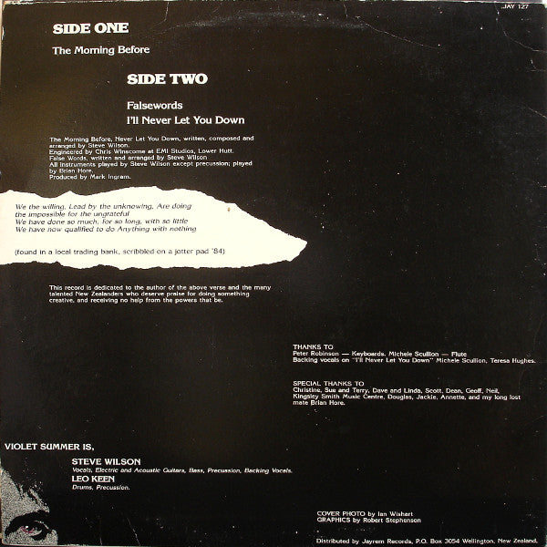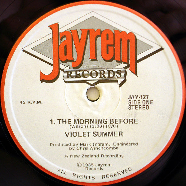 ARTIST: Violet Summer LABEL: Jayrem CAT: JAY 127 PRESSING: NZ YEAR: 1985 RPM: 45 FORMAT: 12 DISC/S: 1 GENRE: AlternativeRock STYLE: Alternative COVER CONDITION: VG++ VINYL CONDITION: NM USED OR NEW: Secondhand