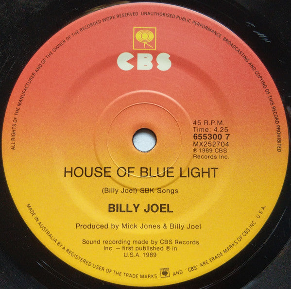 ARTIST: Billy Joel LABEL: CBS CAT: 655300 7 PRESSING: Australia YEAR: 1989 RPM: 45 FORMAT: 7 DISC/S: 1 GENRE: Rock STYLE: COVER CONDITION: VG+ VINYL CONDITION: VG+ USED OR NEW: Secondhand