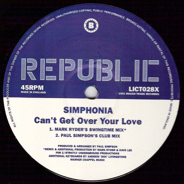 ARTIST: Simphonia LABEL: Republic Records CAT: LICT028X PRESSING: UK YEAR: 1991 RPM: 45 FORMAT: 12 DISC/S: 1 GENRE: ElectronicaGarage House STYLE: Garage House COVER CONDITION: Generic VINYL CONDITION: NM USED OR NEW: Secondhand