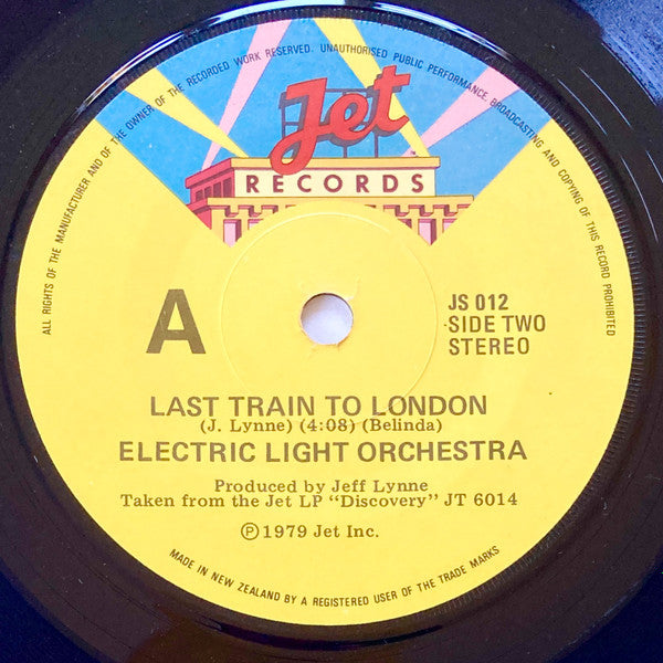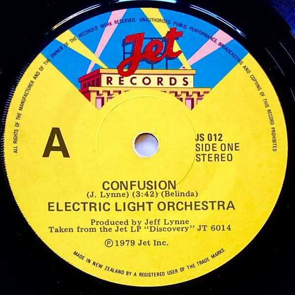 ARTIST: Electric Light Orchestra LABEL: Jet Records CAT: JS 012 PRESSING: NZ YEAR: 1979 RPM: 45 FORMAT: 7 DISC/S: 1 GENRE: Rock STYLE: COVER CONDITION: Generic VINYL CONDITION: VG- USED OR NEW: Secondhand