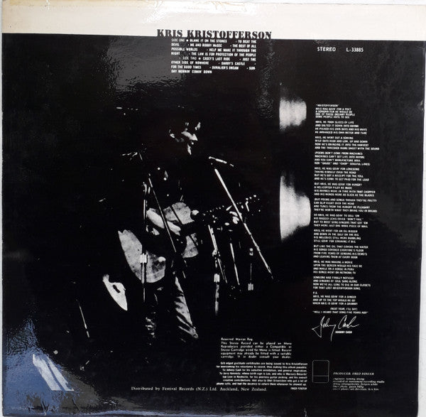 ARTIST: Kris Kristofferson LABEL: Monument CAT: L-33885 PRESSING: NZ YEAR: RPM: 33 FORMAT: 12 DISC/S: 1 GENRE: CountryFolk STYLE: Folk COVER CONDITION: VG+ VINYL CONDITION: VG++ USED OR NEW: Secondhand