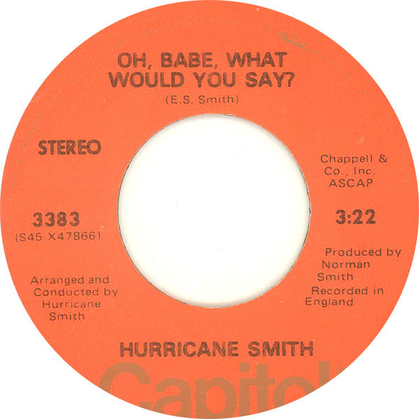 ARTIST: Hurricane Smith LABEL: Capitol CAT: X47867 PRESSING: US YEAR: 1972 RPM: 45 FORMAT: 7 DISC/S: 1 GENRE: Rock STYLE: 0 COVER CONDITION: Generic VINYL CONDITION: VG USED OR NEW: Secondhand